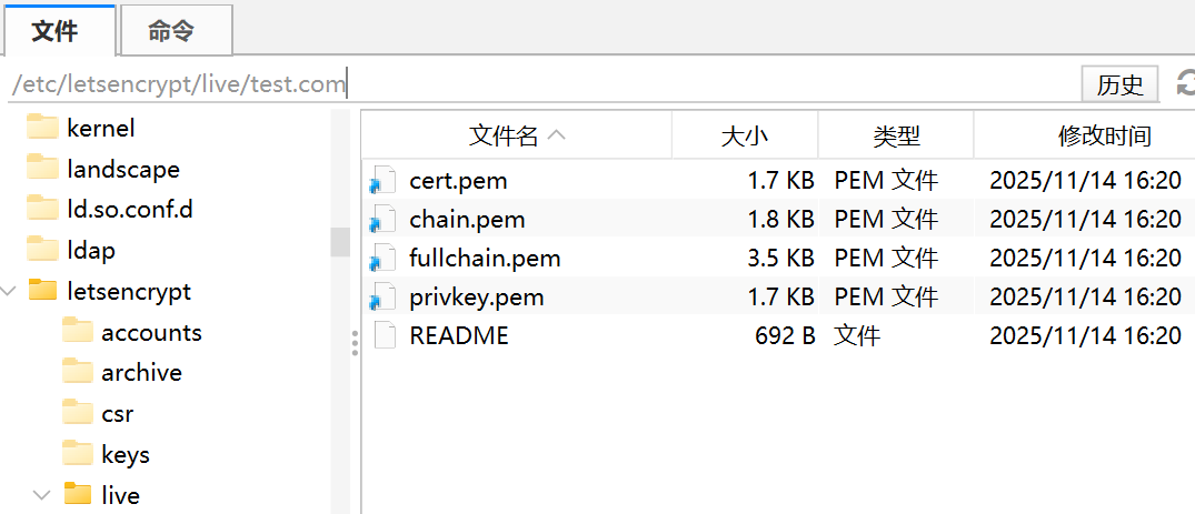 正常情况下会在你的/etc/letsencrypt/live/test.com 文件夹下生成pem证书。